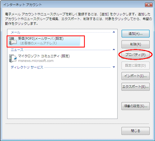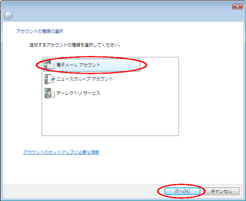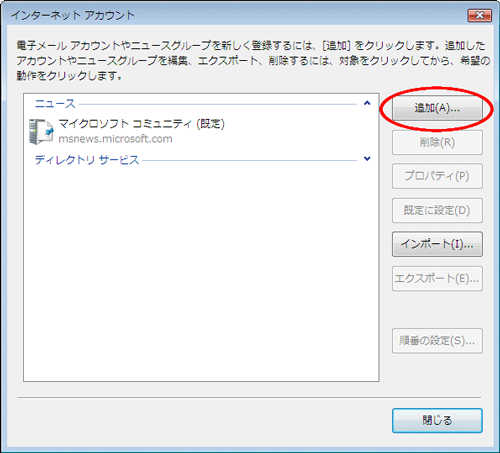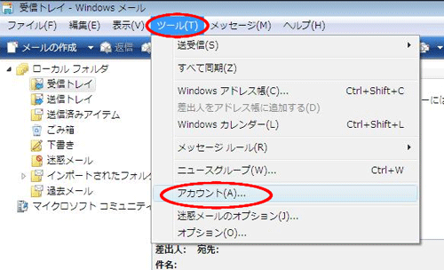 - 「ツール(T)」→「アカウント(A)」を選択し、アカウントの設定画面を開きます。