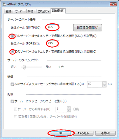 送信サーバ(SMTP)と受信サーバ(POP3)の「このサーバーはセキュリティで保護された接続(SSL)が必要」をチェックします