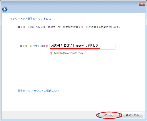 「電子メールアドレス(M)」に、お客様が設定されたメールアドレスを入力します。