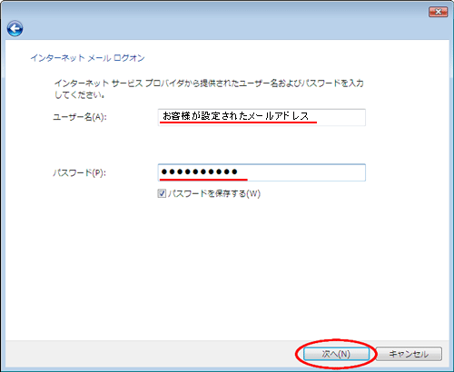 「ユーザー名(A)」に、お客様が設定されたメールアドレスを入力します。