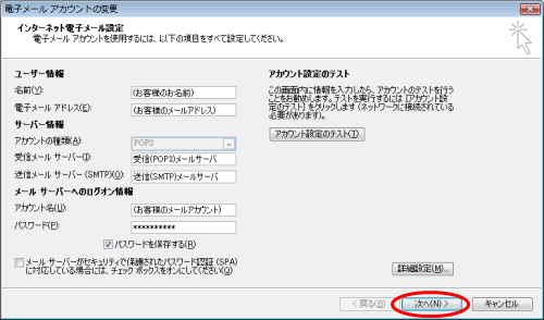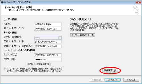 - 電子メールアカウントの画面で、「詳細設定」ボタンをクリックします。