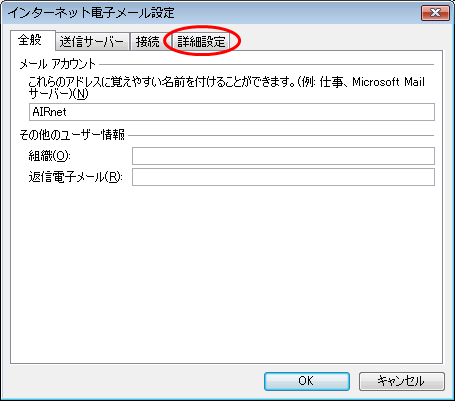 - インターネット電子メール設定の画面で、「詳細設定」のタブをクリックします。