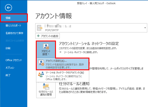 - 「情報」を選択し、「アカウント設定」を選択し「アカウント設定(A)」をクリックします。