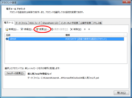 - ご利用のメールアカウントを選択し、「変更」をクリックします。