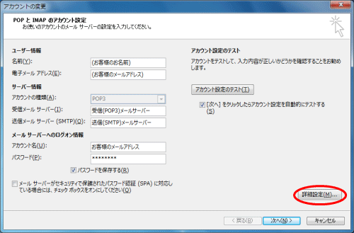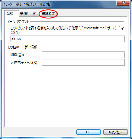 - インターネット電子メール設定の画面で、「詳細設定」のタブをクリックします。