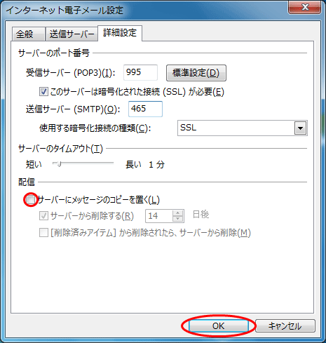 - 「配信」の項目にある「サーバーにメッセージのコピーを置く」のチェックをはずし、