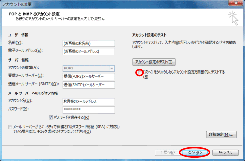 - 元の画面へ戻りますので「[次へ]ボタンをクリックしたらアカウント設定をテストする」のチェックをはずし、「次へ」ボタンをクリックします。
